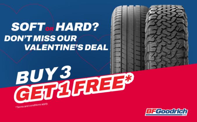 This Valentine’s, show your car some love with an exclusive BUY 3 GET 1 FREE* offer on selected BFGoodrich tyres.